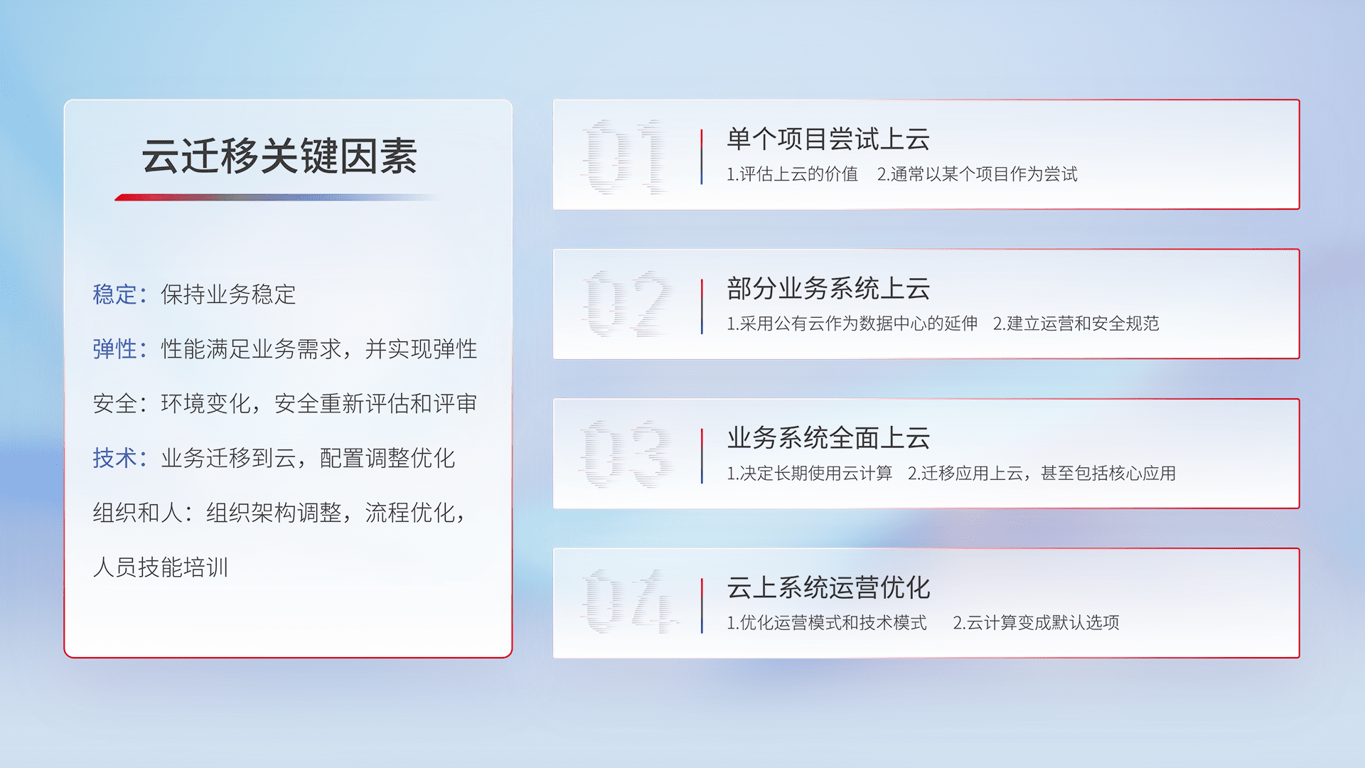 结合实际业务,,,从规划设计、、、、云平台选型、、、、云原生改造、、、、数据迁移、、、集成交付,,,迁移全过程为客户识别最佳上云路径,,,,做好风险识别管理,,设计网络架构、、、、身份权限、、安全审计合规、、、、操作审计、、、、日志审计、、、监控告警策略、、多站点容灾设计等,,对云上基础设施进行整体规划,,,,提升IT治理水平,,,以满足弹性、、高可用、、高性能的需求。。