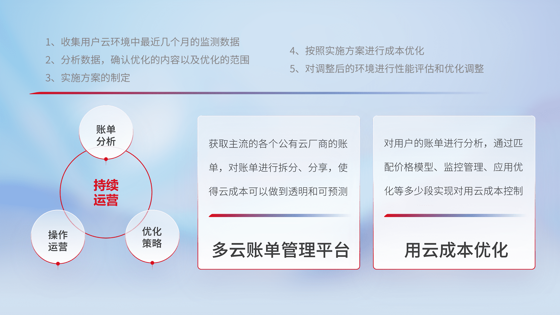 通过多云纳管,,,,以统一的资源数据模型把客户的云资源进行抽象和封装,,进而实现对多云资源的统一操作,,,,保障云资源管理的可靠性、、稳定性与可用性。。。。量身定制化运维内容,,,配置、、开发运维、、补丁管理、、、、备份、、监控、、、、认证和访问管理、、、审计和日常巡检等,,保障在用云过程中的可靠度,,稳定度以及高可用率。。。