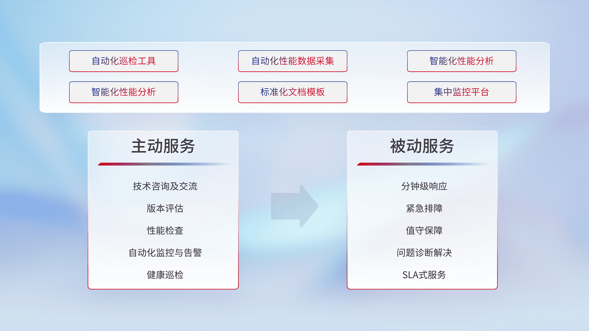 智能化工具和标准化文档,,,保障服务质量,,提供主动服务(包含技术咨询、、、版本评估、、性能检查、、自动化监控与告警、、健康巡检)和被动服务包含(分钟级响应、、、紧急排障、、、、值守保障、、问题诊断解决、、SLA服务)。。。。