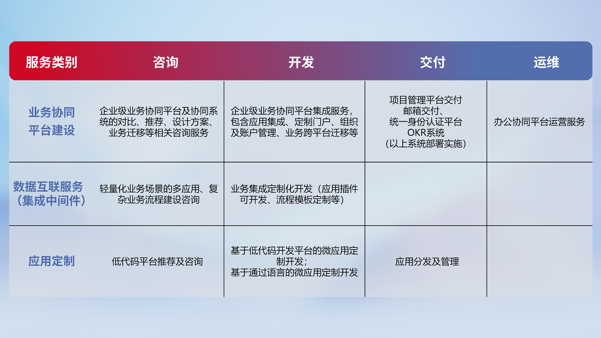 针对钉钉、、企微、、、、IDaas等平台级产品提供产品的规划、、、方案、、、、交付、、、、定制化开发等服务,,,,实现如统一协同办公、、、、智能客户服务、、、、混合会议管理、、、、智能数据查询、、等业务场景,,实现数字化转型。。。